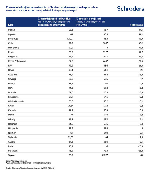 Oczekiwania co do dochodu potrzebnego na emeryturze różniły się geograficznie wśród nieemerytowanych inwestorów z niektórych krajów - Polski i Indonezji - gdzie wierzono, że komfortowe życie na emeryturze będzie wymagało dochodu wyższego niż 100% pensji. Osoby już emerytowane najczęściej otrzymują zdecydowanie mniej, co przedstawia poniższa tabela.