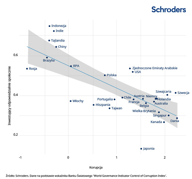 Porównując wnioski z Globalnego Badania Inwestorów z danymi z Banku Światowego można zauważyć, że w krajach o większym poziomie korupcji inwestycje odpowiedzialne społecznie są bardziej preferowane, jak pokazano niżej.