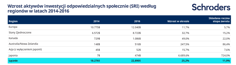 Służą także interesującym porównaniom z danymi branżowymi, takim jak informacje przygotowywane przez Globalny Sojusz ds. Zrównoważonego Inwestowania (ang. Global Sustainable Investment Alliance, GSIA). Ich opracowania wskazują na wzrost zrównoważonych inwestycji w poszczególnych regionach i krajach. Chociaż Japonia znalazła się na końcu tabeli w Lidze Zrównoważonego Inwestowania Schroders, to jednak takie inwestycje należą do najszybciej rozwijających się branż w kraju. Według najbardziej aktualnego raportu GSIA z 2016 r. aktywa inwestycji odpowiedzialnych społecznie przyrastały w Japonii w tempie 724% rocznie, aczkolwiek z niskiego poziomu.