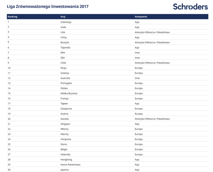 W Globalnym Badaniu Inwestorów przeprowadzonym przez Schroders w 2017 roku(GBI), w ramach którego oceniono 22.100 inwestorów na całym świecie, kraje azjatyckie zdominowały zarówno czołówkę, jak i końcowe miejsca w Lidze Zrównoważonego Inwestowania. Drugie były Indie, a czwarte miejsce zajęły Chiny.