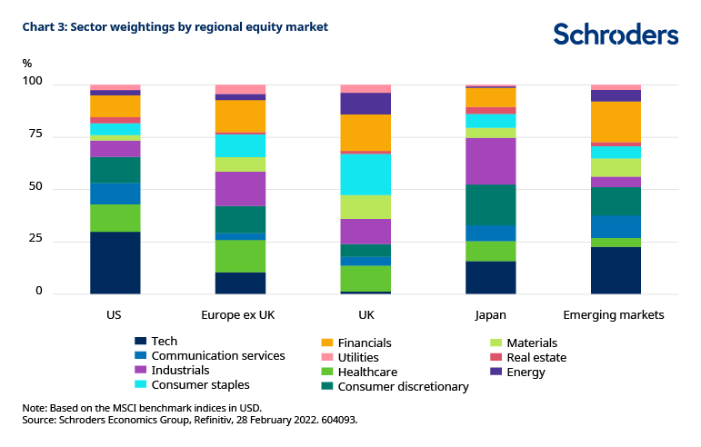 The significant weighting towards the tech sector has meant that US equities have tended to benefit from the fall in real yields (chart 5). Instead, countries such as the UK and Japan, which have a larger exposure to financials, energy and industrials, have typically struggled in this environment.