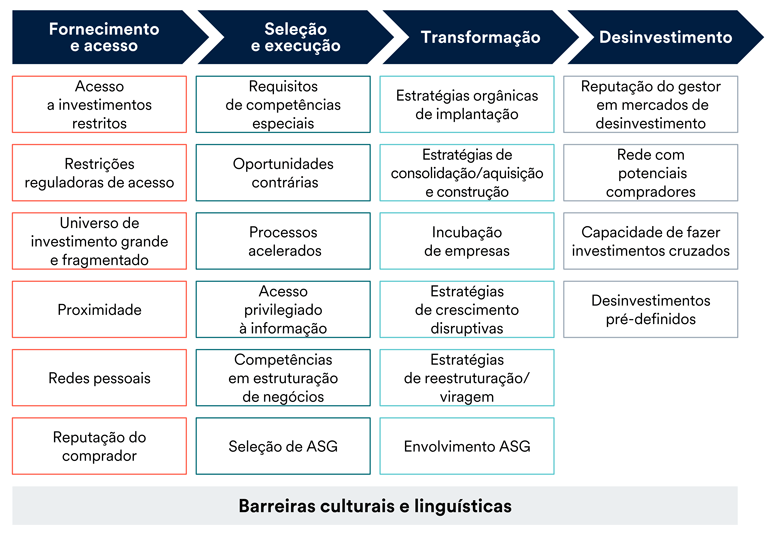 O prémio de complexidade pode ser capturado ao longo do processo de investimento, da descoberta à transformação e à saída de um investimento. Capturar o prémio de complexidade durante a fase de transformação depende das capacidades operacionais do gestor do fundo e da equipa de gestão do ativo subjacente.