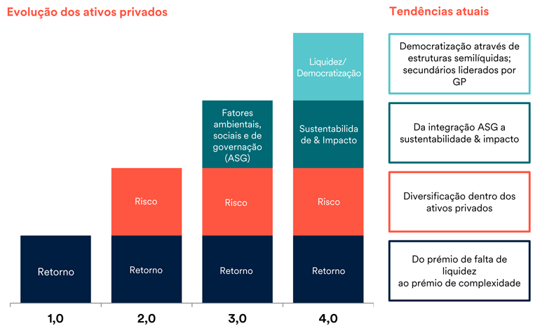 A pandemia acelerou a evolução dos mercados privados para o que designamos “Ativos Privados 4.0”. Esta é a próxima era para os ativos privados e inclui um foco maior em investimentos de impacto e a aceleração da democratização de ativos privados.