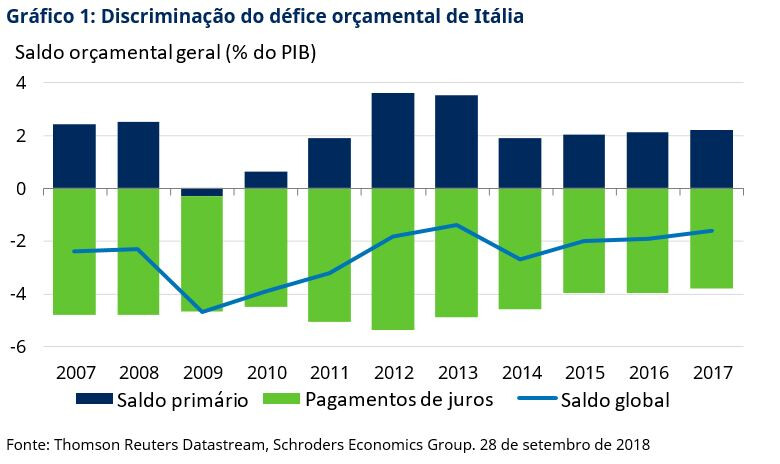 Uma vez que a Itália registou um excedente primário em 10 dos últimos 11 anos, o problema é, claramente, o juro sobre o atual montante de dívida que, quando considerado, significa que o governo tem um défice orçamental global.