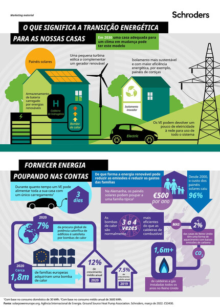 A infografia abaixo mostra o papel que uma casa com “neutralidade carbónica” tem na transição energética e as oportunidades que isso traz para os investidores.