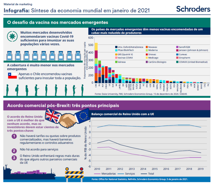 A infografia deste mês analisa o lançamento das vacinas nos mercados emergentes, o acordo do Brexit do Reino Unido, e a deflação na zona euro.