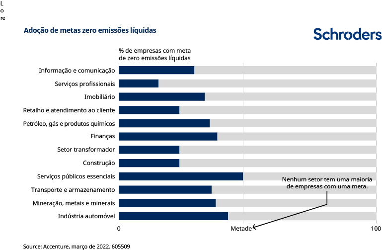 No entanto, como mostra o gráfico abaixo, não há nenhum setor onde a maioria das empresas tenha adotado até agora metas de zero emissões líquidas. Zero emissões líquidas significa reduzir as emissões de gases com efeito de estufa para um valor o mais próximo possível de zero. Para manter o aquecimento global abaixo dos 1,5 °C – conforme exigido no Acordo de Paris – as emissões têm de ser reduzidas em 45% até 2030 e chegar a zero líquidas até 2050.