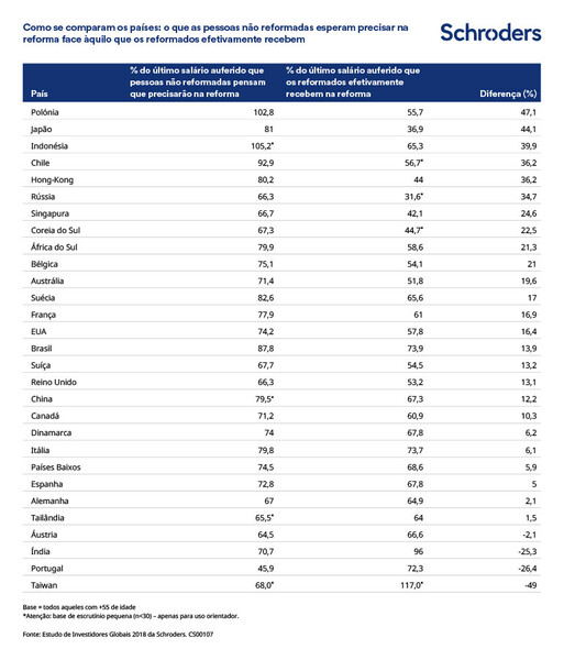 As expectativas para o rendimento necessário na reforma variaram de região para região com os investidores não reformados em alguns países – Polónia e Indonésia – a acreditarem que precisam de mais de 100% do seu salário para terem uma reforma confortável. Os já aposentados recebem tipicamente muito menos, conforme mostra a tabela abaixo.