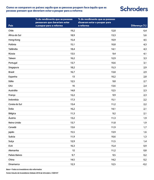 O fosso entre aquilo que as pessoas estão a poupar e o que pensam que deveriam estar a poupar foi maior nas economias em desenvolvimento. Por exemplo, as pessoas no Chile estão atualmente a poupar 12,8% do seu salário atual, mas acham que deveriam estar a poupar 19,2%, uma diferença de 6,4%.