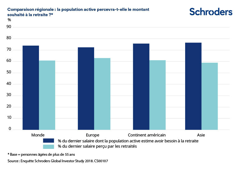 Em todas as regiões, os investidores na Ásia e Américas esperam precisar da maior taxa de substituição, acreditando que precisarão de três quartos do seu salário atual.