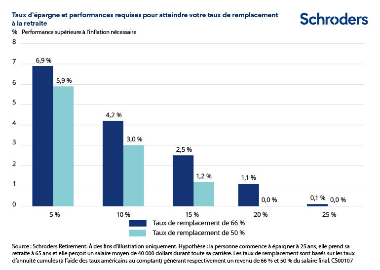 Fonte: Departamento de Planos de Reforma da Schroders. Meramente ilustrativo. A começar aos 25 anos, a reformar-se aos 65 e com base num salário médio de 40.000 dólares ao longo da vida. As taxas de substituição são baseadas nas taxas combinadas de anuidade (usando taxas spot dos EUA) com geração de rendimento de 66% e 50% do último salário auferido, respetivamente
