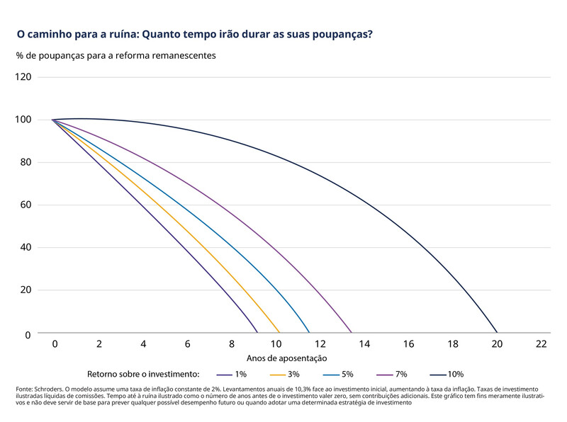 A tabela abaixo, baseada na análise da Schroders, mostra os efeitos de uma taxa de levantamento de 10,3% numa carteira.