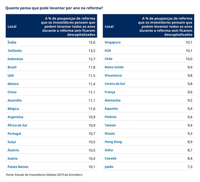 O Estudo de Investidores Globais 2019 da Schroders também destacou as disparidades geográficas em relação à proporção média que os investidores sentem que podem retirar das suas poupanças de reforma por ano sem ficarem descapitalizados. Os investidores na Índia registaram a maior média (15,0%); os investidores japoneses registaram a menor (7,3%).