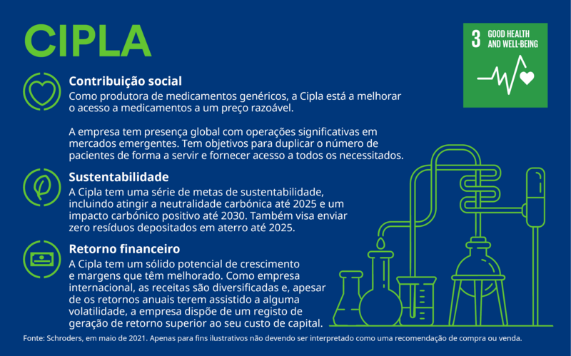 A Cipla está a contribuir para a redução do custo dos seus produtos e, portanto, está a aumentar a acessibilidade a medicamentos e terapias essenciais. Também está a contribuir com os seus processos de fabrico e atividades filantrópicas através da Cipla Foundation.
