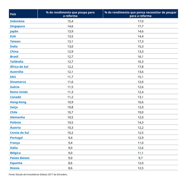 O Estudo de Investidores Globais (GIS) 2017 da Schroders, que inquiriu mais de 22 mil pessoas que investem, constatou que a maior percentagem do rendimento poupado para a reforma é, em média, na Ásia, com 13,0%, e a menor é na Europa, com 9,9%. Nas Américas, o investidor médio poupa 12,5% do respetivo rendimento para a reforma.