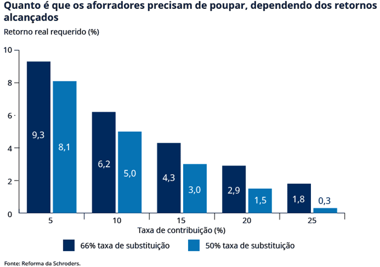 Fonte: Reforma da Schroders. Apenas para ilustração. Idade inicial de 30 anos, com reforma aos 65 anos. Salário inicial de £35.000 com crescimento à taxa da inflação. Taxa de substituição baseada nas atuais taxas de anuidade com geração de rendimento de 66% e 50% do salário final, respetivamente