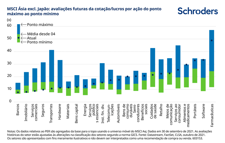 As áreas do mercado bolsista da Ásia que parecem baratas em termos de múltiplos são setores como a banca, seguradoras ou o imobiliário. Estes setores são tipicamente beneficiados por taxas de juro e de inflação mais elevadas, logo, pode haver oportunidades para uma melhoria nos retornos a médio prazo se a inflação for mais do que apenas um problema “temporário”. No entanto, estas indústrias enfrentam desafios estruturais contínuos com o surgimento das fintech e do comércio eletrónico na região, o que limita o nosso entusiasmo.