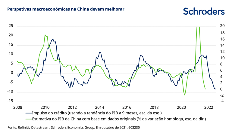 Também esperamos ver uma retoma nos principais indicadores económicos, em busca de sinais de melhoria futura. Por exemplo, embora o impulso do crédito - a variação de 12 meses nos novos empréstimos como percentagem do PIB - tenha continuado a diminuir em outubro de 2021, dando sinais de condições económicas fracas no verão de 2022, fê-lo a um ritmo mais lento. O impulso pode atingir o ponto mínimo do ciclo e aumentar na passagem para o próximo ano, implicando uma melhoria na atividade no segundo semestre de 2022.