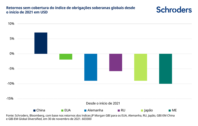No entanto, as reformas regulamentares, a crise da energia e a volatilidade imobiliária em resultado de medidas regulamentares e preocupações com a Evergrande, revelaram ser questões adicionais para os mercados negociarem. E isso levou a algum desempenho divergente entre os mercados de obrigações e de ações em 2021.