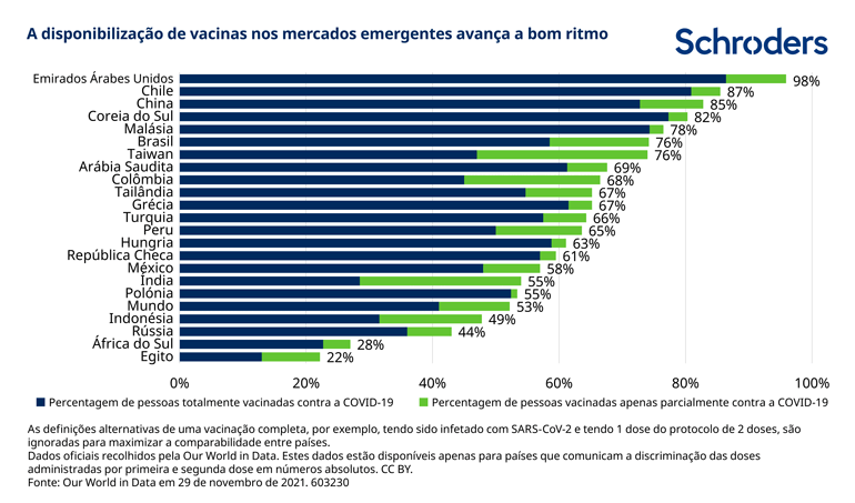 À medida que avançamos para 2022, é muito encorajador que a taxa de vacinação nos mercados emergentes (ME) tenha registado uma aceleração acentuada, mesmo que novas variantes como a Ómicron ainda possam representar um risco. A vacinação ajudou a apoiar o crescimento económico, mas é improvável que isto se repita em 2022.