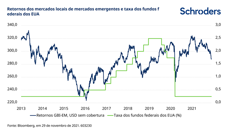 Embora os investidores possam temer os efeitos do aumento das taxas de juro nos Estados Unidos, os mercados são mecanismos de desconto e muito já foi incorporado. Como mostra o gráfico a seguir, o início do último ciclo de aumentos em dezembro de 2015 coincidiu com uma recuperação dos retornos do mercado local para os investidores que durou dois anos. Este ciclo - desde falar sobre redução gradual dos estímulos, passando pela redução gradual efetiva, até à sua eliminação - deverá ser muito mais curto, sugerindo que uma alta percentagem das perdas foram incorporadas.