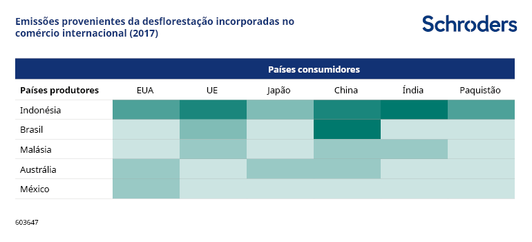 Considerar o país de produção por si só é retratar apenas uma parte da realidade, dada a natureza global e interligada das cadeias de abastecimento. Uma análise das emissões relacionadas com a desflorestação incorporadas no comércio internacional destaca que a Indonésia é o maior exportador destas matérias-primas, dados os elevados níveis de consumo interno no Brasil. A China é o maior importador, seguida pela União Europeia e pela Índia.
