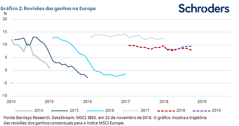 Além disso, a Alemanha, em particular, tem crescido abaixo das expectativas. Isto deve-se principalmente a alterações na regulamentação sobre as emissões do gasóleo para a indústria automóvel. No entanto, temos a sensação de que o problema industrial alemão é temporário e, portanto, ajudará a garantir o crescimento positivo dos lucros das empresas em 2019 (ver gráfico 2).