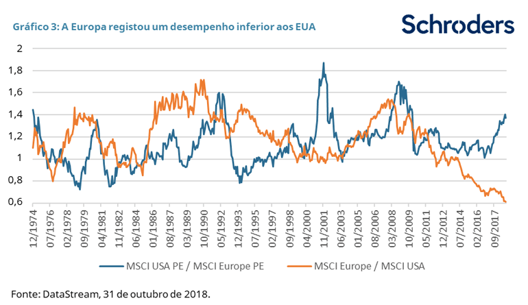 É de esperar que as inevitáveis incertezas políticas na Europa proporcionem aos investidores oportunidades para comprar ações selecionadas a níveis atrativos. Atualmente, o sentimento internacional face às ações europeias é extremamente cético, dados os receios relacionados com o Brexit e com o orçamento italiano. A história do mercado bolsista mostra que tais momentos de sentimento extremo podem ser uma boa oportunidade para adotar uma abordagem contrária. Alguns investidores podem, portanto, considerar uma afetação tática de curto prazo às ações europeias.
