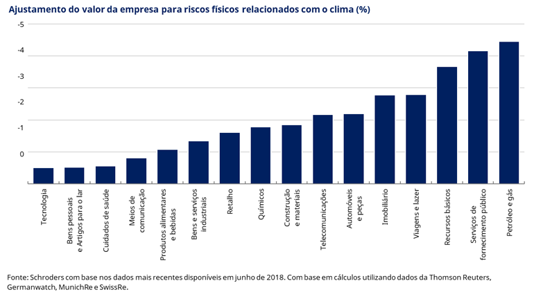 Identificámos os setores do petróleo e gás, serviços públicos e recursos básicos como os setores mais expostos ao impacto físico das alterações climáticas. O custo potencial de segurar os ativos físicos equivale a mais de 3% dos respetivos valores de mercado. Os setores menos em risco são os setores de tecnologia, bens pessoais e artigos para o lar e os cuidados de saúde.