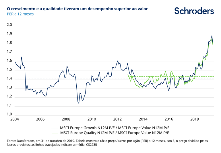 À medida que avançamos para 2020, a grande questão na mente de todos os investidores em ações europeias é saber se a rotação do mercado, que levou a que recentemente o ‘valor’ tivesse registado um desempenho forte, irá continuar. O índice MSCI EMU Value proporcionou um retorno de 9,0% nos últimos três meses, comparado com os 6,9% do índice MSCI EMU Growth (FactSet, em 29 de novembro).