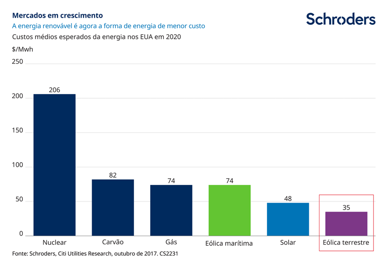 Dentro deste último grupo, haverá um número significativo de beneficiários da mudança para uma atividade mais sustentável. O processo de transição energética já está em andamento, apesar do apoio bastante morno de muitos governos, incluindo dos EUA. Felizmente, a razão económica continua a prevalecer e a enorme vantagem de custo das fontes de geração eólica e solar em comparação com as tradicionais (ver o gráfico abaixo) está a traduzir-se num enorme estímulo para muitas empresas de energias renováveis.