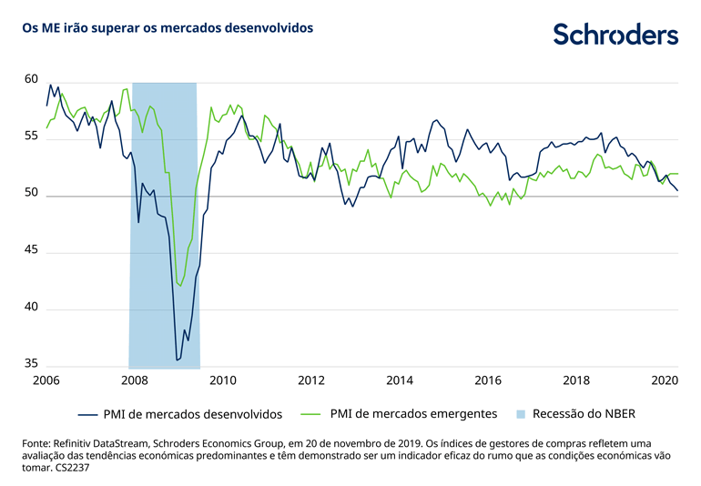 Depois de um período de crescimento mais fraco, a economia mundial parece estar pronta para recuperar em 2020, prolongando um dos períodos de expansão mais longos da história. A desaceleração deste ano suscitou receios de uma eventual contração da economia norte-americana. De facto, vemos que a atividade se apoia num alívio das tensões comerciais entre os EUA e a China e em taxas de juro mais baixas nos EUA. A nossa previsão de crescimento global para 2020 foi melhorada de 2,4 para 2,6 %.