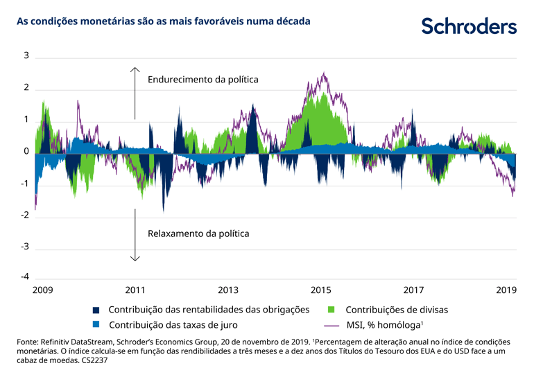 Para além do apoio de uma redução nas tensões comerciais, também se sentirão os benefícios de taxas de juro mais baixas, que facilitam a obtenção de crédito. As condições monetárias em geral, tendo em conta as taxas de juro dos bancos centrais, a rendibilidade das obrigações e o dólar norte-americano, são as menos restritivas em quase uma década (ver o gráfico). Isto facilita a obtenção de crédito por parte das famílias e das empresas e a circulação de dinheiro pelo sistema global. Já estamos a notar o efeito disto no mercado imobiliário dos EUA, onde os pedidos de crédito à habitação e a construção de casas têm aumentado consideravelmente.