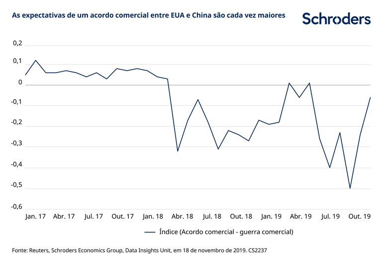 Existem bons motivos para que o presidente Trump possa estar agora mais disposto a chegar a um entendimento. O presidente, que enfrenta o processo de destituição no seu país e a aproximação de eleições, necessita de impulsionar a atividade económica dos EUA. Tendo já jogado a carta orçamental através dos cortes fiscais em 2018, só lhe resta proporcionar algum alívio no comércio, em particular na sua base, através do aumento das compras de produtos agrícolas por parte da China. Enquanto isso, os EUA parecem renitentes em reduzir as tarifas aduaneiras, algo que a China tem pressionado, e o progresso é lento.