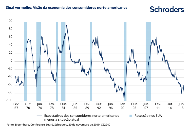 Um exemplo disso é a visão dos consumidores norte-americanos sobre as condições económicas atuais e futuras, como mostra o gráfico abaixo. O gráfico mostra as expectativas dos consumidores dos EUA em relação às condições económicas, incluindo perspetivas de emprego e rendimento, menos a sua avaliação da situação atual. Como o gráfico demonstra, quando esta medida diminui significativamente, tende a ocorrer uma recessão logo a seguir (quando a economia se contrai).