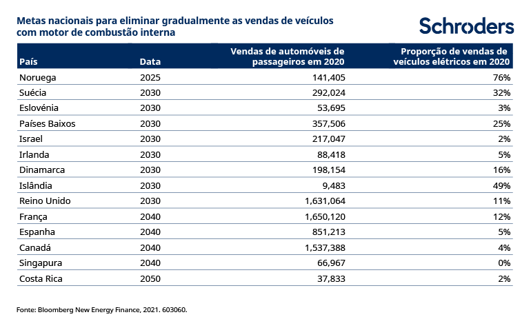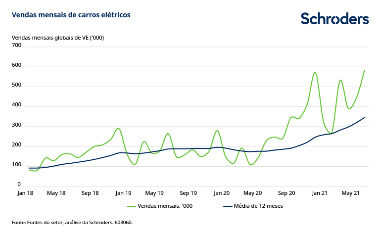 Este ano, as vendas de veículos elétricos (VE) registaram um forte aumento. Nos 12 meses até junho de 2021, as vendas de VE aumentaram 160% face ao mesmo período do ano anterior e mais de 130% em relação ao período comparável em 2019 (de acordo com os dados da BNEF). Este crescimento foi sublinhado na última atualização do Painel do Progresso Climático da Schroders.