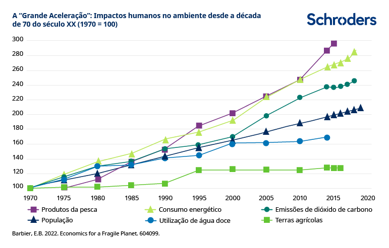 Tal como o gráfico acima deixa claro, o impacto humano no ambiente tem vindo a acelerar a um ritmo alarmante. Os tópicos da biodiversidade e da escassez de recursos naturais serão cada vez mais segmentados.