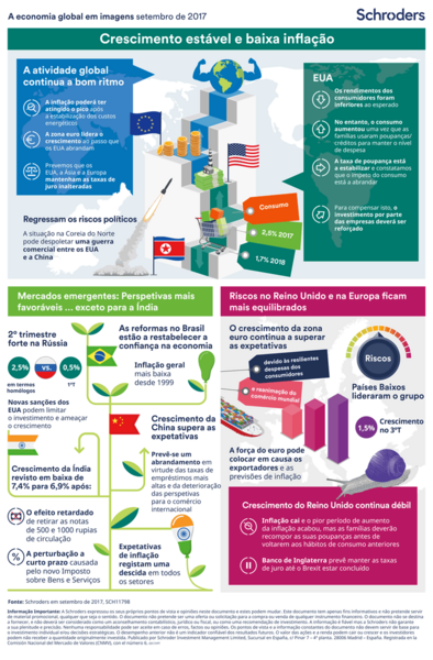 Na infografia deste mês recolhemos os fatores que estão a garantir a solidez da economia global, analisamos as razões pelas quais as perspetivas dos mercados emergentes são positivas (exceto na India) e os riscos que a Europa e o Reino Unido devem enfrentar.