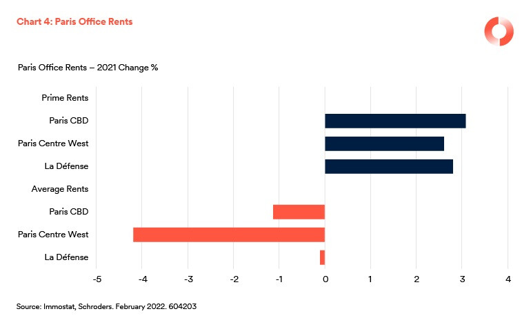 Several cities saw an increase in prime rents in 2021, including Amsterdam, Frankfurt, London and Paris, whereas secondary rents either fell, or were at best flat. The recent low level of development in many European cities has provided further support for prime rents.