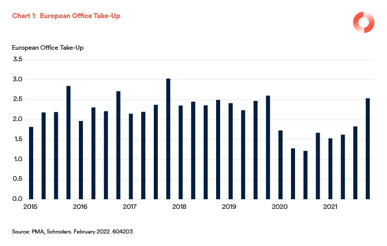 Last year saw a strong recovery in office demand across Europe as economies emerged from the first wave of lockdowns. Take-up in the second half of 2021 was 50% higher than in the same period of 2020, but still 20% below its pre-pandemic average. In addition, the increase in office vacancy slowed sharply, as the amount of surplus space which companies wish to sub-let stabilised.