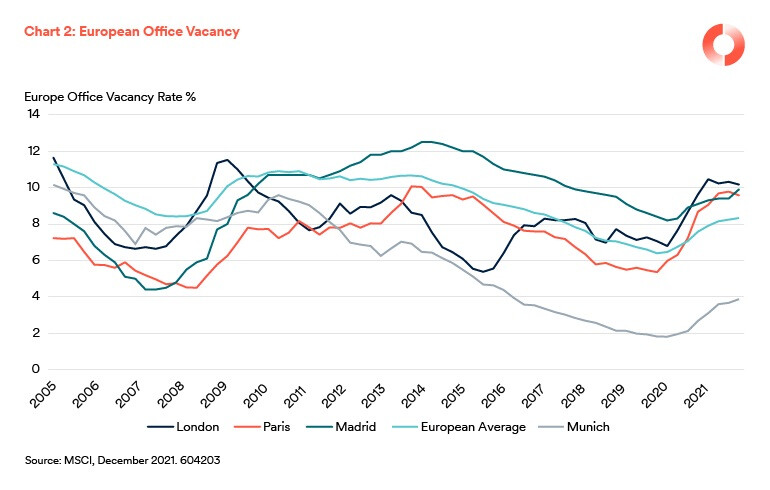 The average office vacancy rate in Europe, at 8.3% in September 2021, was only marginally higher than in June (8.1%) and well below the peak of 10.9% reached in 2010, following the global financial crisis (GFC).