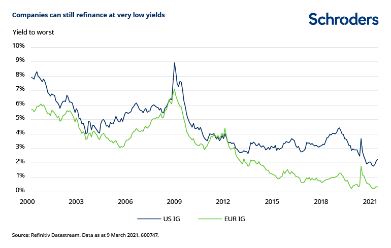 Furthermore, even with the latest increase in yields, the yields of US and euro investment grade are still extremely low, standing at 2.3% and 0.3% respectively. So issuing bonds now could still lead to a lower weighted average cost of debt, if the new bonds replace bonds issued at higher yields.