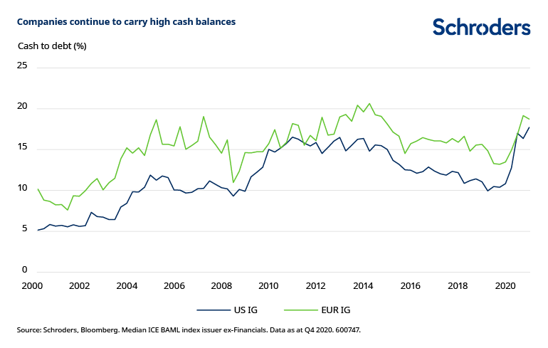 As the gap between gross and net leverage shows, companies continue to carry elevated cash balances. In fact, the US IG cash to debt ratio increased further in Q4, now standing at 18x. This indicates that companies have been cautious, largely keeping in place the buffers built in the Covid-19 crisis.