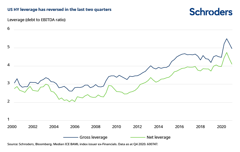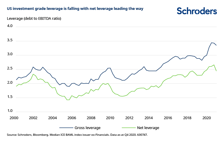 The latest data show that US investment grade (IG) gross leverage, the debt to earnings before interest, tax, debt and amortisation (EBITDA) ratio, ticked lower in Q4, continuing to fall from the record high.