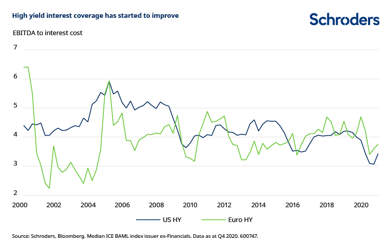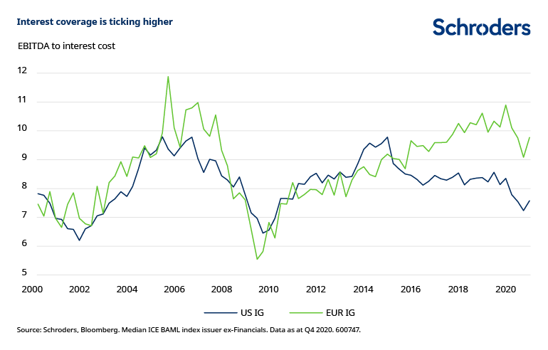 The resilience of interest coverage again illustrates how the lower cost of debt has cancelled out higher volumes of debt, even when factoring in the record debt issuance in 2020. Similarly to leverage, the recovery in earnings should be a tailwind for interest coverage in 2021.