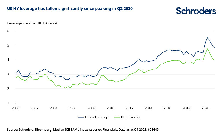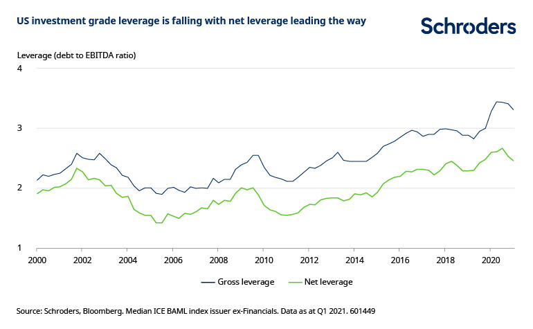 The latest data show that US investment grade (IG) gross leverage, the debt to earnings before interest, tax, debt and amortisation (EBITDA) ratio, ticked lower in Q1, continuing to fall from the record high.