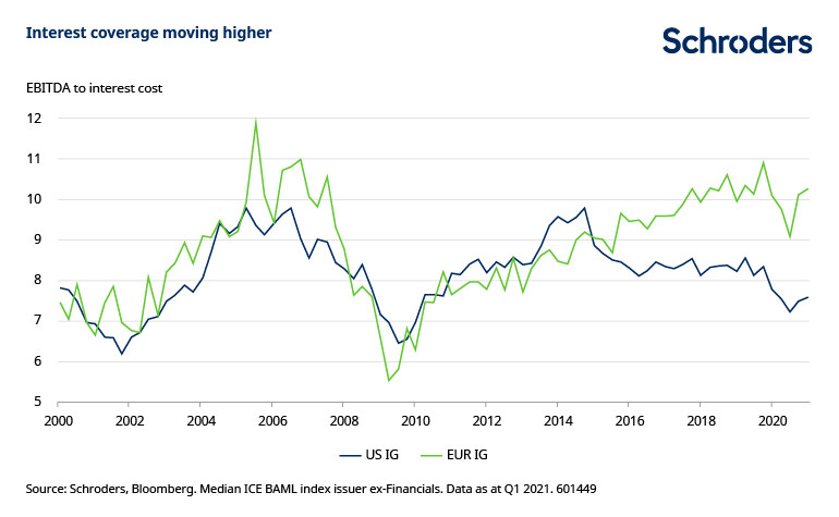 Across the Atlantic, leverage has continued to fall as well, following a similar path to the US. This shows that hiccups in the vaccine rollout in Europe and renewed lockdowns in some countries have not had too much of an impact on corporate fundamentals. With reopening now in full force again, earnings should start to really pick up, providing further impetus for deleveraging.