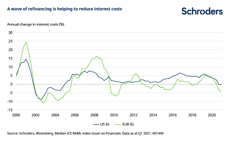 In addition, the increase in bond yields earlier this year has had no real impact on the interest costs of companies. In fact, many companies managed to reduce their interest bill in the first quarter through refinancing existing, higher-yielding debt.