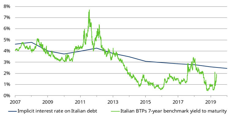 The recent spike up in Italian bond yields appears dramatic, but in fact, the yield on the comparable seven-year bond has remained below the average interest rate paid on existing debt. This therefore means that the average cost of Italy’s debt stock is still falling. The seven-year bond yield would need to rise from its current level of 1.8% to over 2.4% before it starts to have a negative impact on Italy’s public finances (chart 2).
