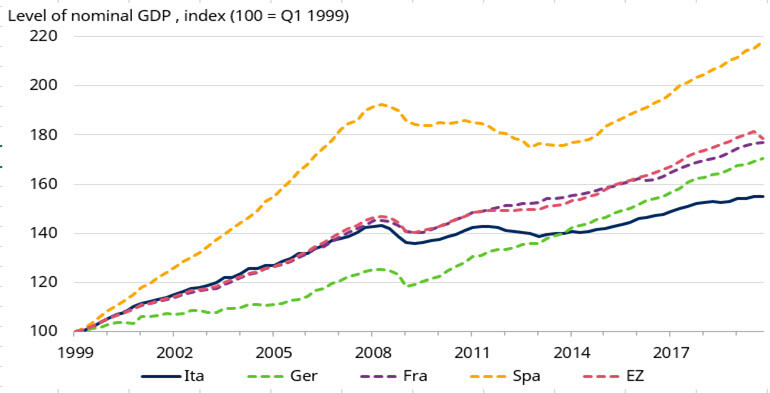 The lack of growth in Italy is one of the fundamental reasons for its poor public finances, and why it is approaching the point where its debt becomes unsustainable. Even before 2009, though Italy was growing at a reasonable rate, it was doing so with poor productivity growth and losing competitiveness in international markets. During the GFC and the subsequent European Sovereign Debt Crisis, Italy failed to reform its labour markets and follow in the success of Ireland, Spain and Portugal in regaining competitiveness.